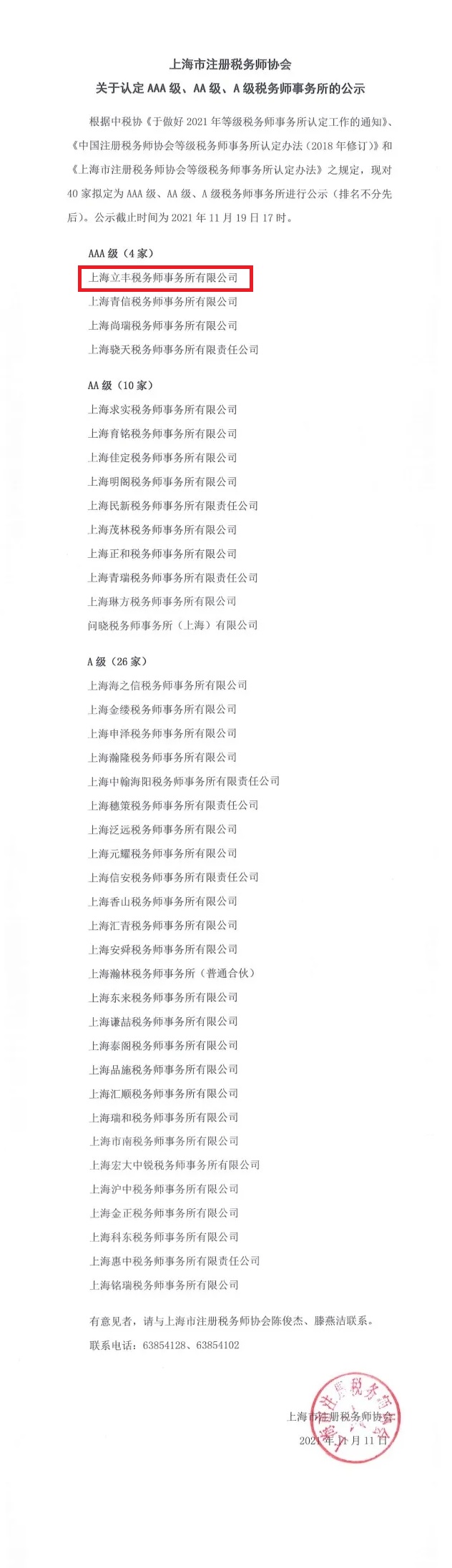 关于上海注册税务师协会认定我司为AAA级税务师事务所的公示